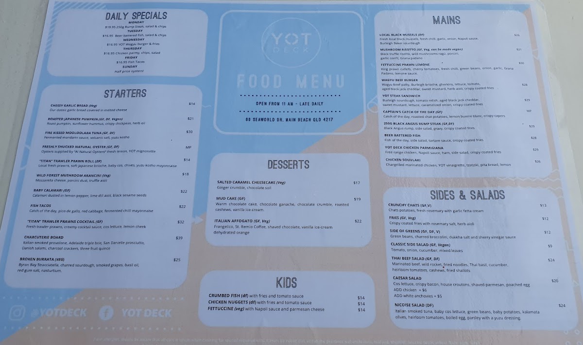 Welcome to YOT Deck, a culinary gem nestled at 60 Seaworld Dr, Main Beach, QLD 4217, Australia. This remarkable venue offers not just a dining experience but a stunning panorama that elevates every meal to a memorable event. With its prime location right by the harbour, YOT Deck is more than just a restaurant; it is a feast for the senses.