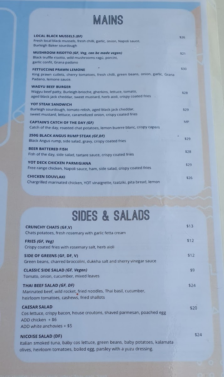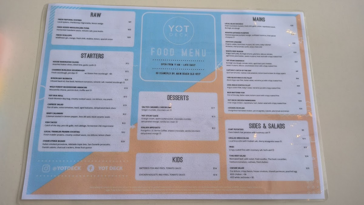 In conclusion, YOT Deck is not merely a restaurant; it is a destination where food, service, and views converge to create perfect dining moments. Here, each dish is crafted with care, designed to be savored as you soak in the beauty of your surroundings. Whether you are looking for a casual outing, a celebration, or simply a place to unwind with great food and company, YOT Deck invites you to experience the best of Main Beach. We eagerly await your visit!