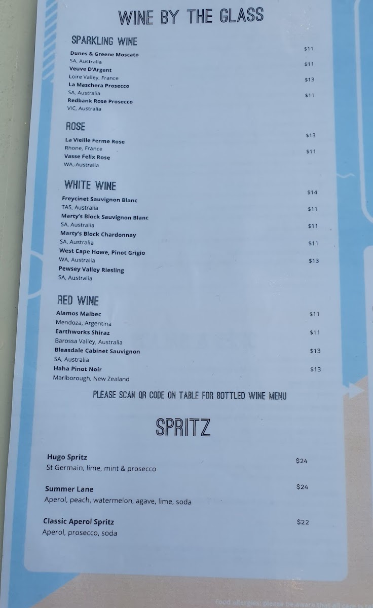 “ Sunday afternoon with live music, place was pumping. It's not fun sitting in full sun on the deck, the umbrellas prove little to no shade. Food & can be ordered at counter/bar or by QR code. Oysters were plump and fresh, calamari was delicious as were the prawn rolls. Mains were steak, pasta, steak sandwich and fish & chips. Location, view is fabulous, the service average. We went through five rounds of cocktails, they were pretty good. ”